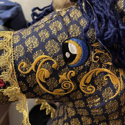 Der Wappenrock ist mit Goldbrokatborte verziert und wird auf der Schulter mit einem golden Knopf geschlossen.